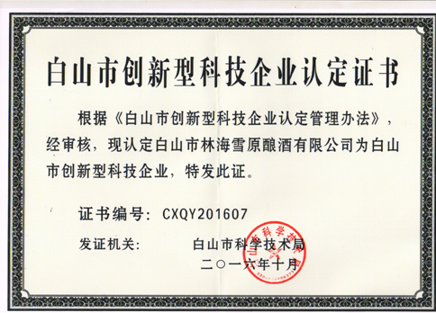 2016年10月被评为“白山市创新型科技企业”。