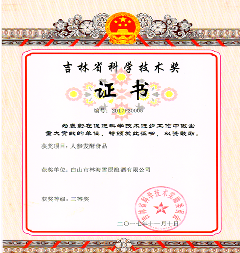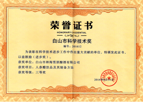 2016年8月《人参醋饮品及其制备方法》项目获得白山市科学技术奖。