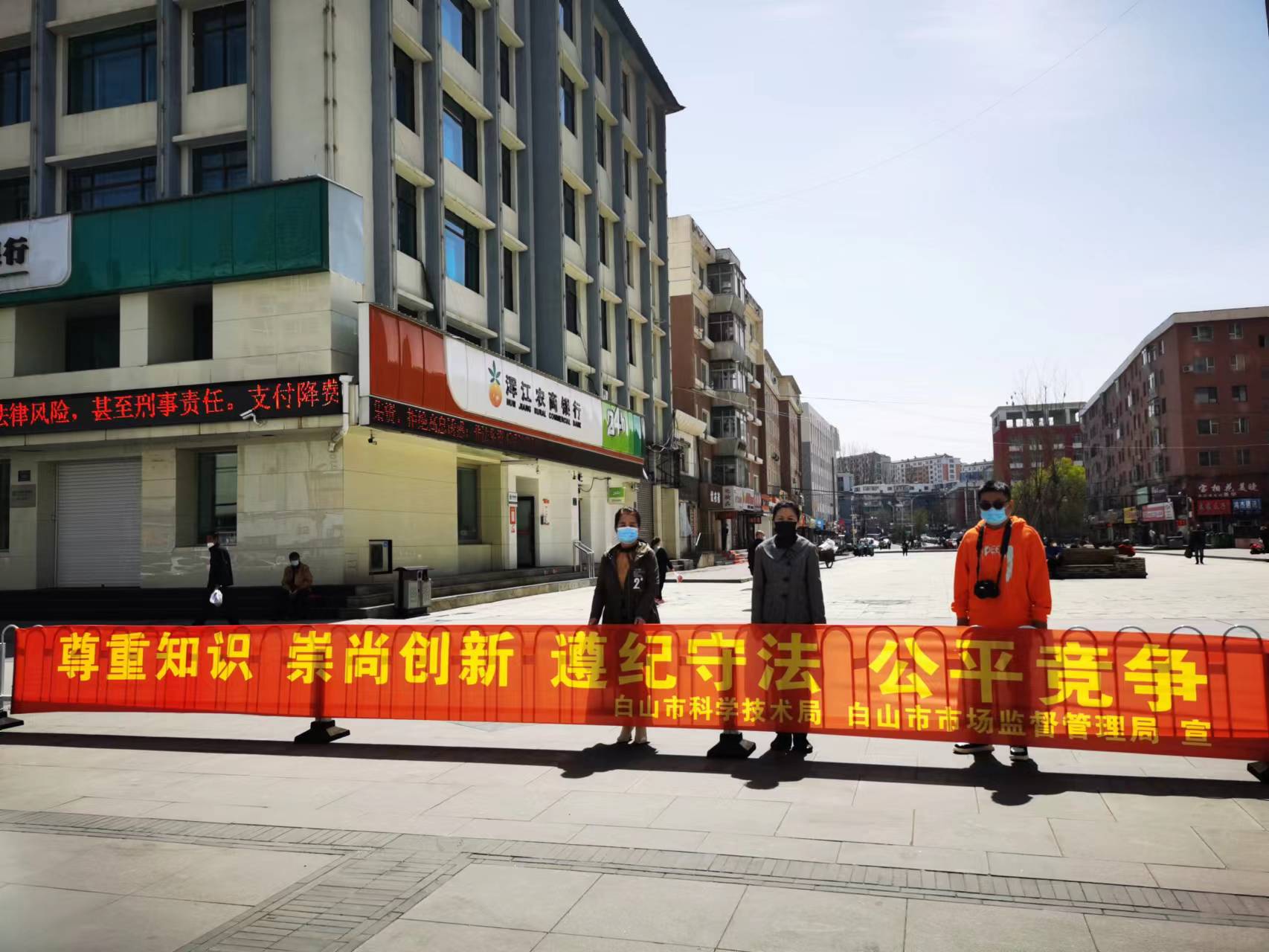 条幅内容为“全面开启知识产权强国建设新征程,尊重知识,崇尚创新,遵纪守法,公平竞争”,悬挂于市中心步行街处,白山市由于疫情原因,原计划的设立咨询台、发放宣传手册、现场解说等方式取消。